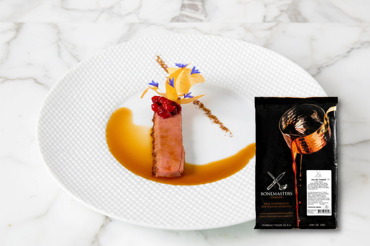 Les fonds et jus Bonemasters représentent la quintessence de la qualité dans ce domaine. Produits à partir d'éléments nutritifs frais (non surgelés) selon un procédé identique à la cuisine traditionnelle, ils ne contiennent ni sel, ni aucun additif ni épaississant ou exhausteur de goût. Seuls sont ajoutés oignons, carottes, céleri, champignons, thym frais, bouquet garni... Les 25 ans d'expérience et la passion de leur créateur, Conrad Brown, garantissent la qualité, la couleur, la texture et le goût de ces fonds et jus. Leur régularité exemplaire est garantie par des approvisionnements maîtrisés en os et coupes spécifiques, des meilleures origines, de qualité constante, choisis pour leur saveur bien marquée et naturellement salée. La méthode de fabrication, traditionnelle et naturelle mais exécutée avec une rigueur scientifique, donne une caramélisation parfaite, sans amertume, une couleur, une brillance et une saveur exceptionnelles. Ces jus et fonds de base de la cuisine traditionnelle française évitent un travail long, fastidieux et coûteux (12h de réduction pour les fonds, 24h pour les jus et 36h pour les glaces). Elles garantissent une régularité remarquable, tout en permettant aux chefs d'exprimer librement leur créativité à partir de ces fondamentaux solides. Livrés surgelés, ils se conservent jusqu'à 5 semaines au frigo, une fois décongelés. Les recettes du chef Onno Kokmeijer, Restaurant Ciel Bleu** Amsterdam, sont sur la chaîne YouTube Le Delas.