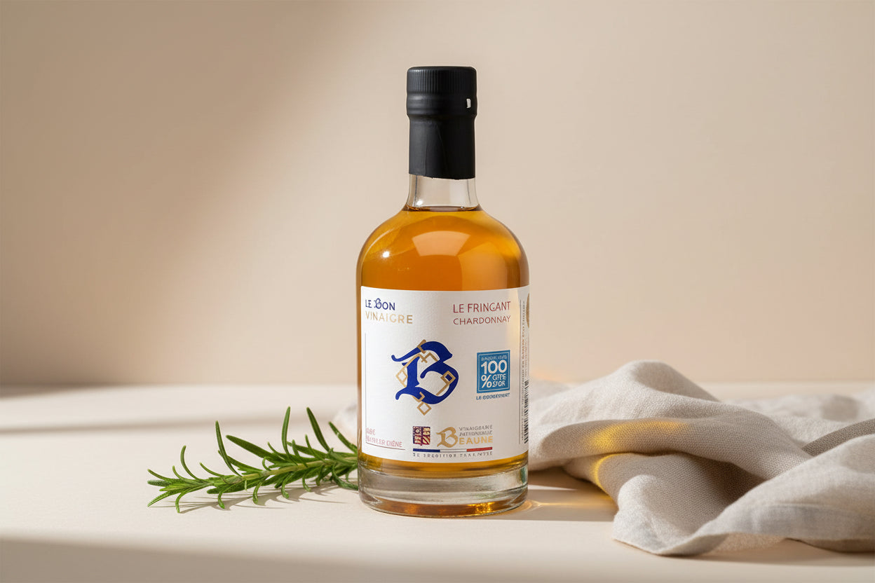 Le Fringant Chardonnay, véritable dandy des vinaigres, est élaboré à partir du cépage Chardonnay, emblème des terres bourguignonnes. Son élevage en fût de chêne lui apporte une fraîcheur et un peps incomparables. Avec une acidité de 6%, il se révèle idéal pour concocter des sauces hollandaise et béarnaise, déglacer des viandes blanches ou simplement réveiller une salade verte. Un incontournable pour les amateurs de cuisine punchy !