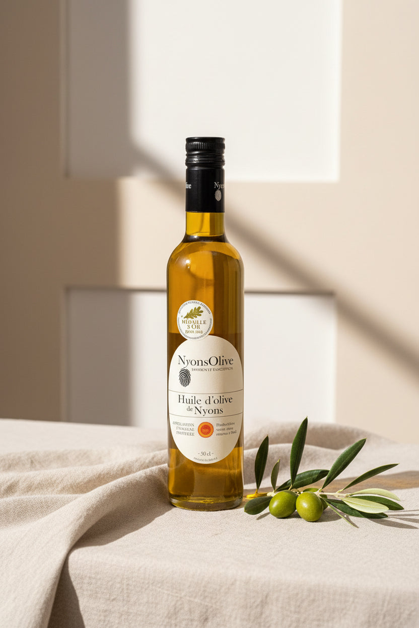 L'huile de Nyons est issue de la première pression à froid d'olives de la variété Tanche. Cette huile de qualité vierge extra se caractérise par son onctuosité, sa couleur vert doré et ses arômes fins de fruits, de noisettes et d'amandes. Elle doit son caractère à une récolte tardive (décembre/ janvier) et de son terroir. L'huile d'olive de Nyons AOP est multi-usage. Douce en bouche, elle est parfaite sur des crudités. Supportant la chaleur, elle peut être utilisée pour la finition de plats chauds, pour la cuisson et même la friture.