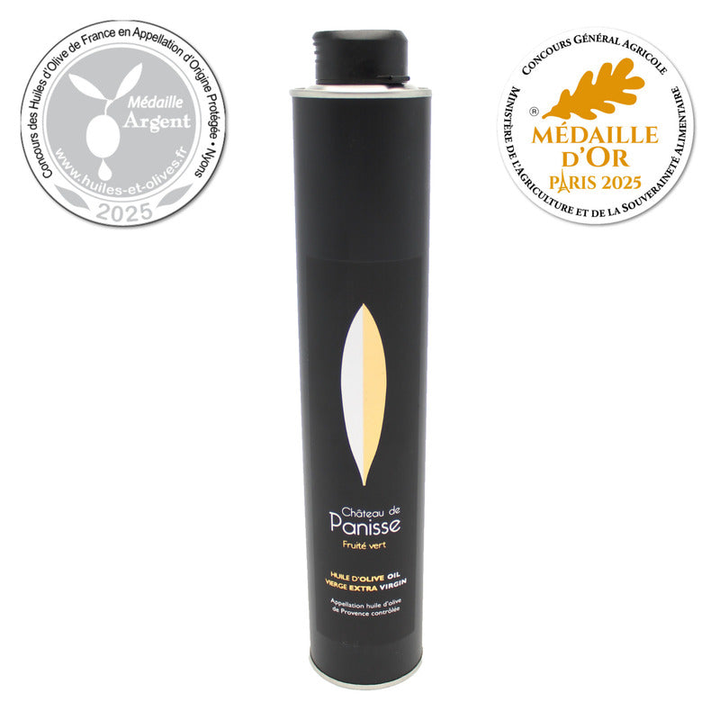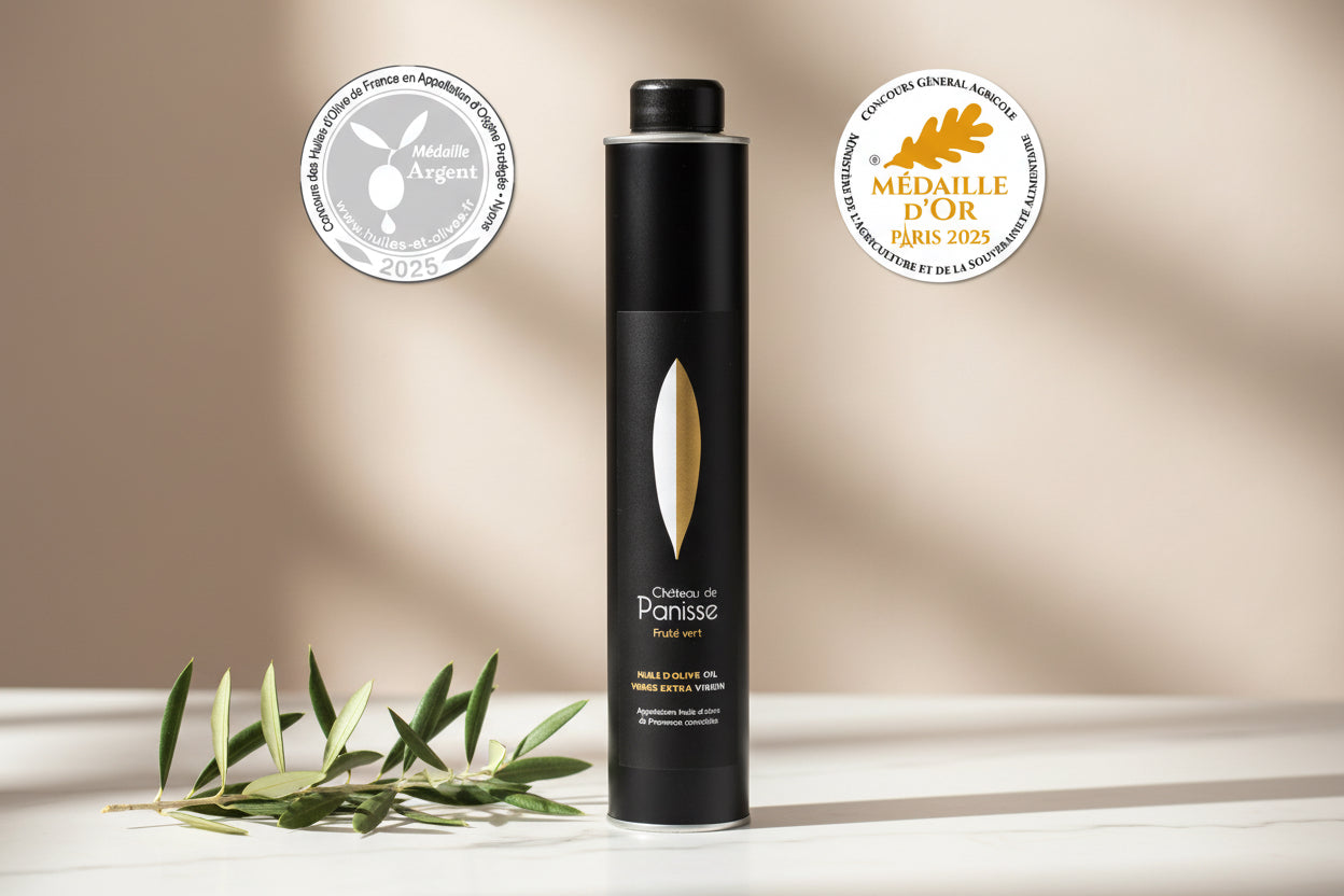 Le Château de Panisse se situe au cœur de la Provence, pays de l'olivier et de l'huile d'olive, privilégié par son soleil et son ciel bleu où souffle le mistral. Cette localisation sur 15 hectares autour du château du XVe siècle, les variétés d'oliviers et l'aération de la plantation ont permis à ces huiles d'olive Fruité Vert et Noir d'Olives maturées d'obtenir l'AOC "Huile d'olive de Provence". La Picholine, monovariétale, est issue à 100% de la variété d'olives Picholine provenant d'un verger voisin. Fruité Vert a reçu la médaille d'or du 10e Concours National des Huiles d'Olives de France en Appellation d'Origine 2013 et la médaille d'argent 2018 au Concours Général Agricole de Paris et New-York. Noir d'Olives maturées a obtenu la médaille d'or au Concours Général Agricole de Paris 2014 et en 2018, la médaille d'or du concours des huiles en AOC AOP à Nyons ainsi qu'un 3e Épicure d'Or de l'Épicerie Fine.