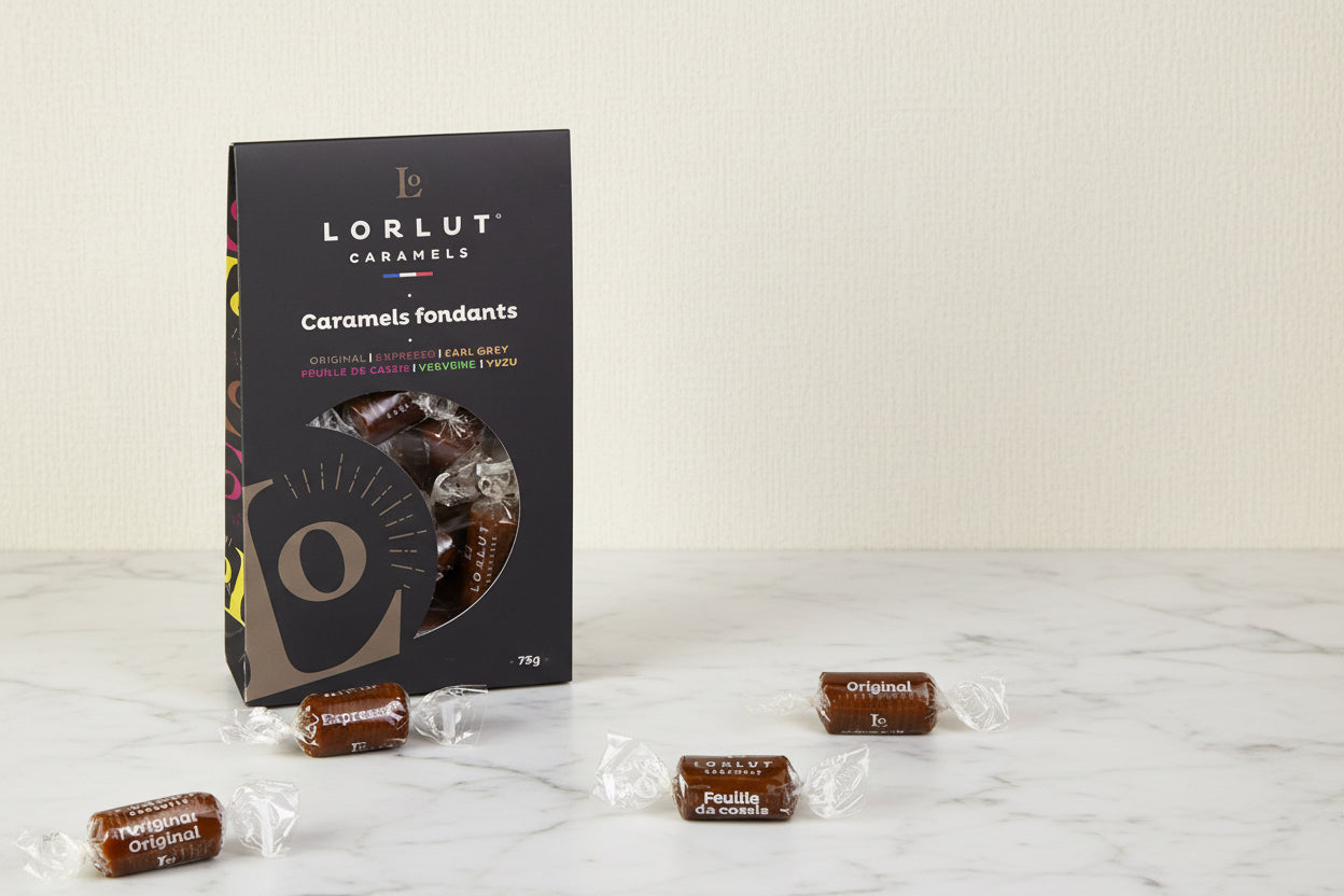 Ce coffret de caramels haut de gamme ultra fondants se décline en 6 variétés : Original, Expresso, Earl-Grey, Feuille de Cassis, Verveine, Yuzu.