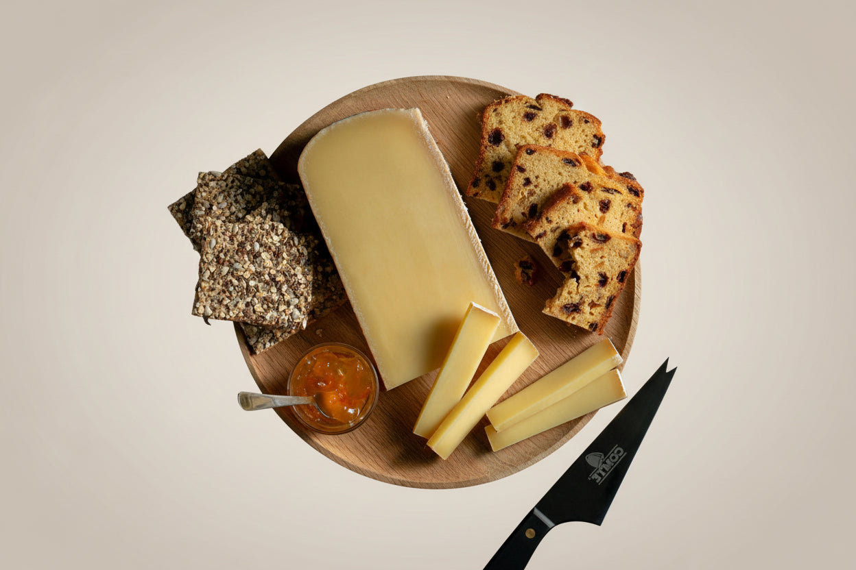 Ce produit d'exception est un comté extra AOP au lait cru de vache, disponible uniquement pour les fêtes de fin d'année et Pâques, après au minimum 24 mois d'affinage lent au fort de Saint-Antoine, dans les montagnes du Jura.