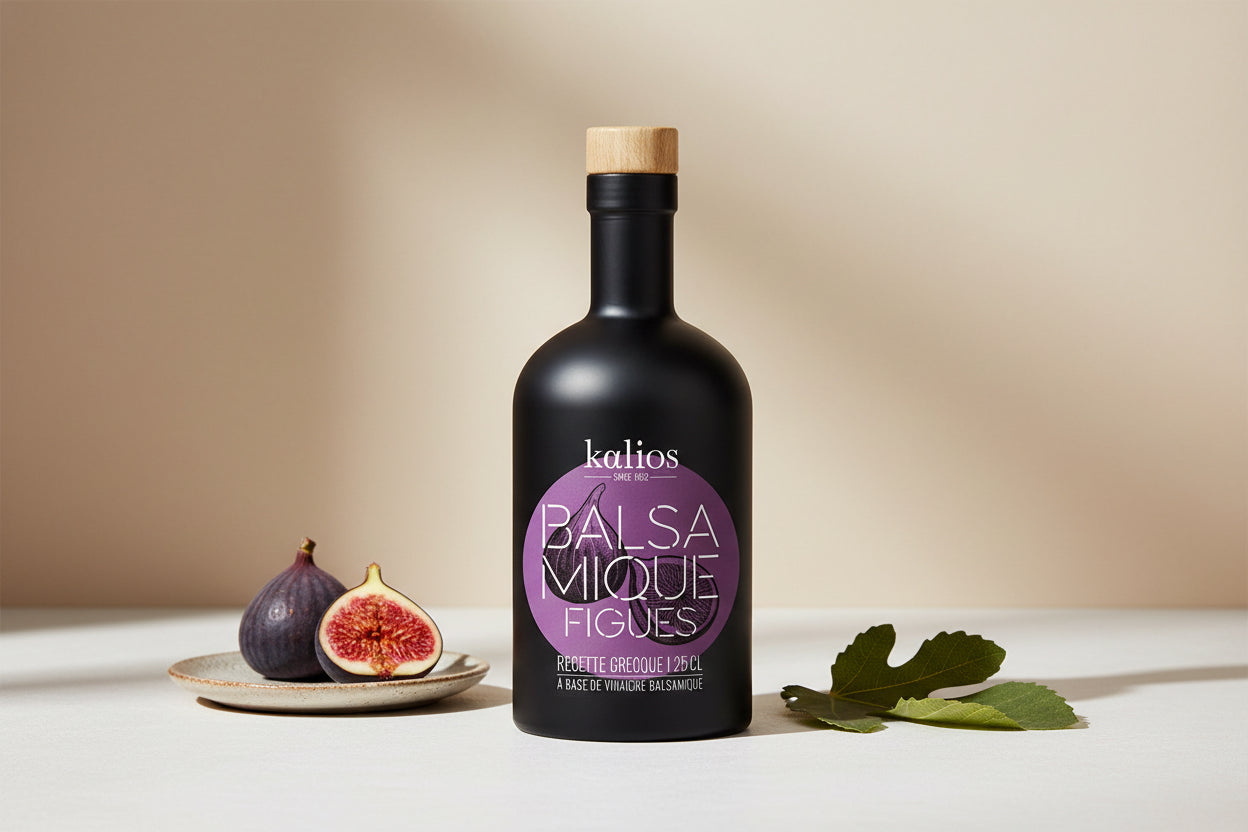 Ce balsamique de figues est le fruit d'une recette grecque. Il est élaboré à partir de moût de figues séchées et de vinaigre de raisin, vieilli pendant 5 ans en fûts de chêne, pour une saveur plus boisée et des notes fruitées. Il a une faible acidité et une texture soyeuse. Il ne contient aucun additif ni sucre ajouté. C'est un formidable exhausteur de goût à incorporer aux vinaigrettes, pour déglacer un magret de canard, un foie gras, pour mariner des viandes (filet mignon, filet de volaille...) ou des poissons, pour accompagner le fromage... Côté sucré, c'est ingrédient qui sublime la saveur des fraises, des salades de fruits...