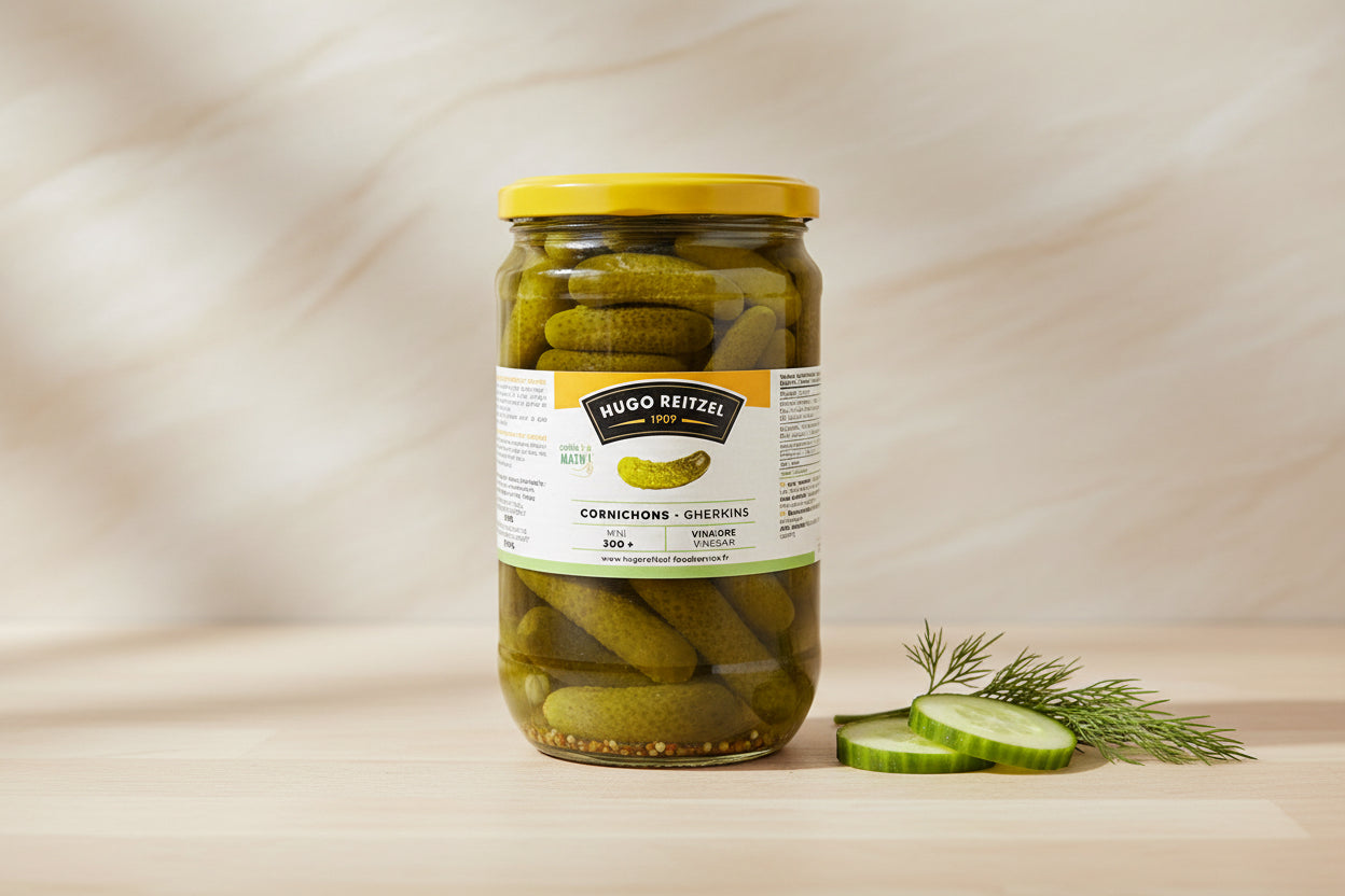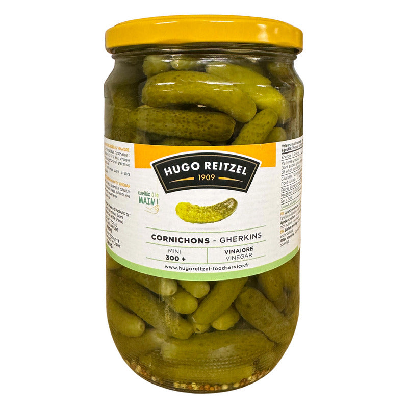 Ces cornichons extra-fins sont préparés aux deux vinaigres. Très croquants et de petite taille, ils sont parfaits, en autres, en accompagnement de charcuterie, coupés en deux dans un sandwich ou à l'apéritif. Ce format de 72cl, en bocal de verre, convient particulièrement bien à la revente.