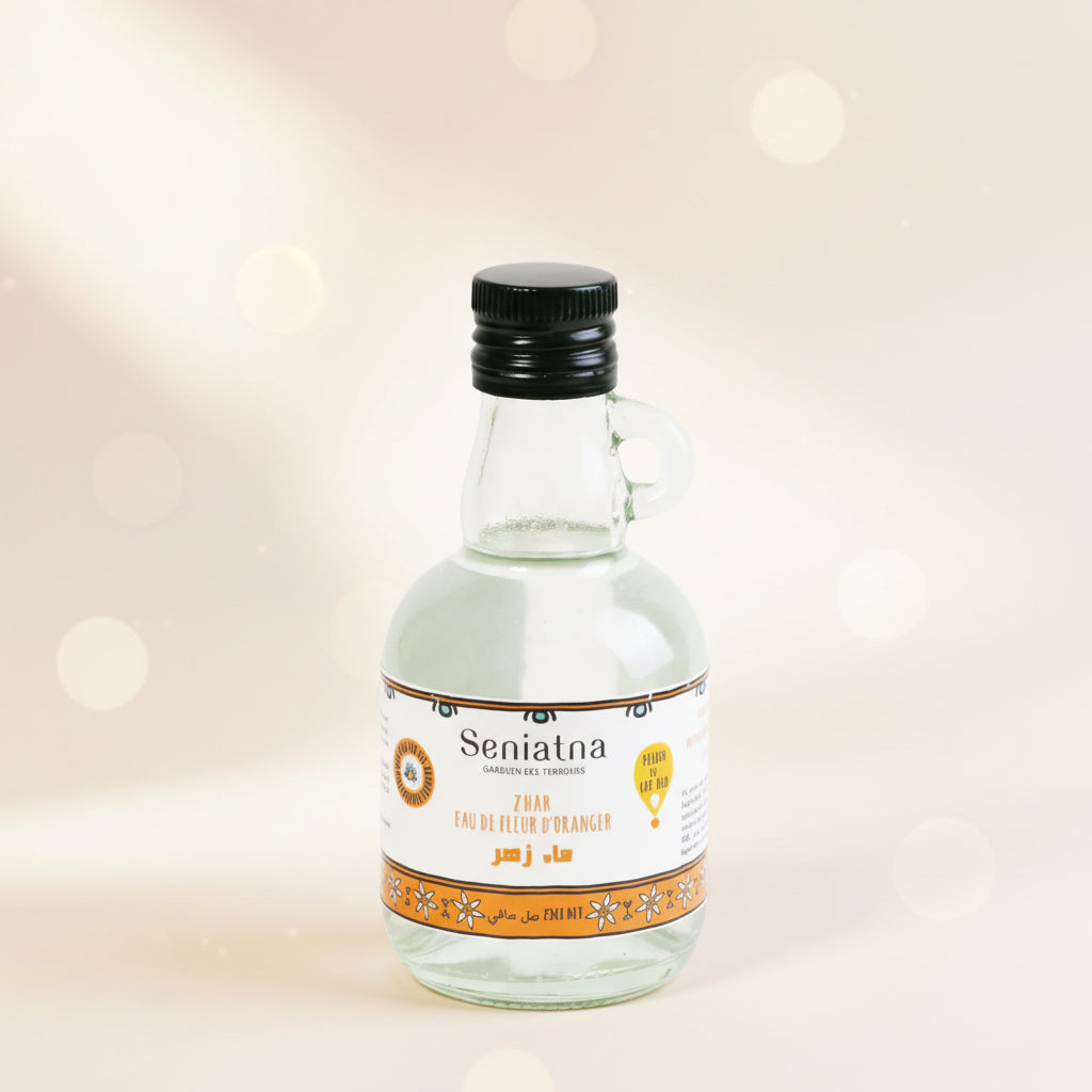 Cette eau de fleurs d'orangers provient de la cueillette à la main de fleurs ouvertes au Cap-Bon en Tunisie, lentement distillées par des artisanes dans la région, sans filtrage préalable de l'huile essentielle. Le tri est également manuel pour retirer parfaitement feuilles et insectes. À base uniquement d'hydrolat de fleurs, ce délicat concentré naturel d'arôme parfume idéalement les pâtisseries et les boissons.